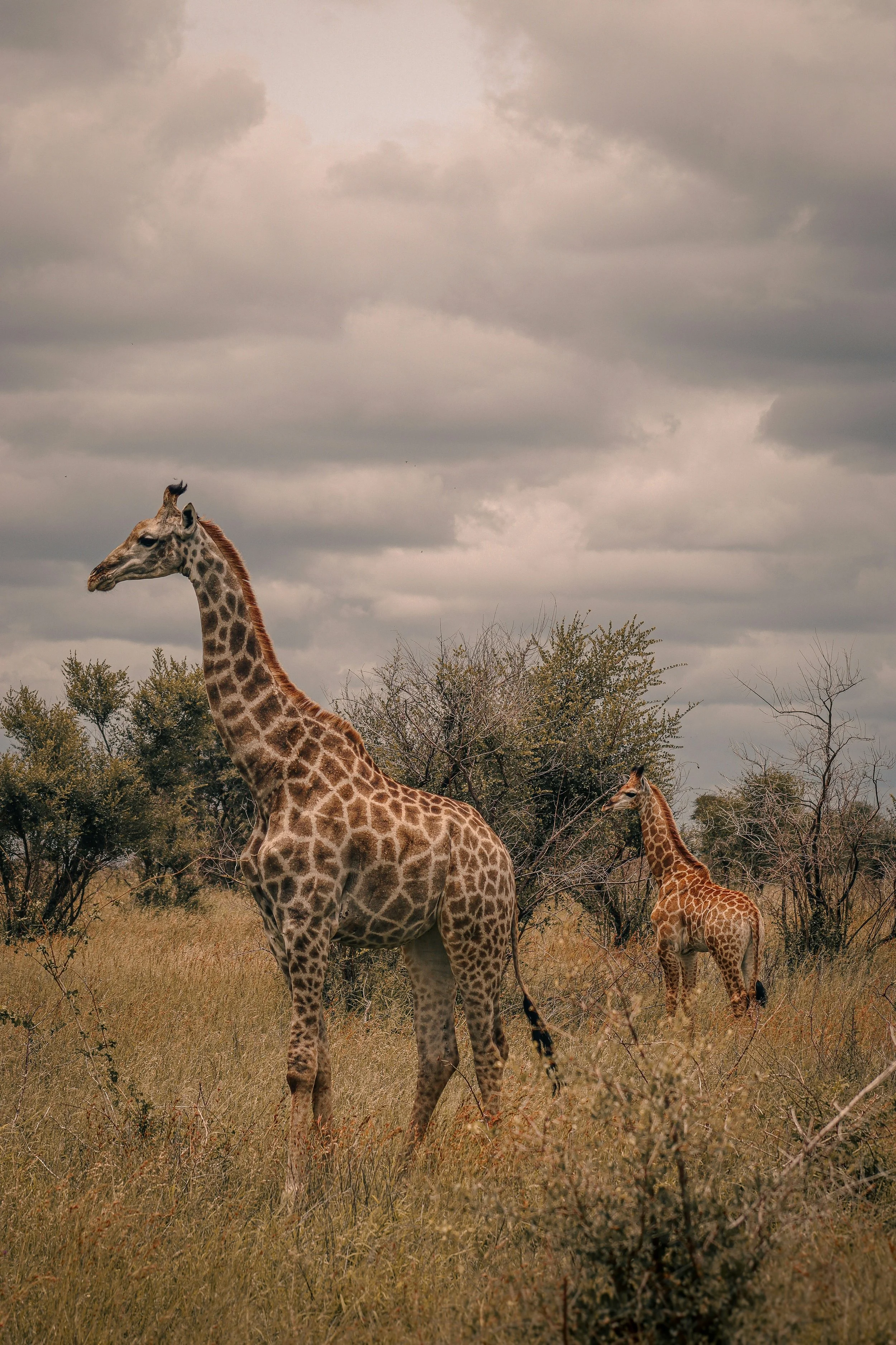 They are herbivores and feast on the high leaves of the African veld—Acacia tree leaves are their favorite. They eat about 75 pounds of food each day.